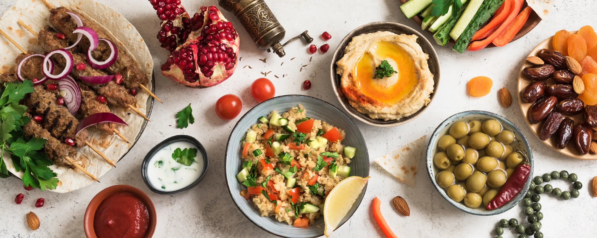 Mezze - Crudites, Olives, Sunblushed Tomatoes & Artichokes with Warm Breads and Pittas, Dipping Oils, Caramelised Onion Hummus, Beetroot, Tahini & Dill Dip and Red Pepper & Pomegranate Muhammara (VE)